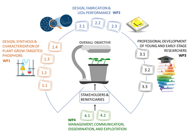 In light of global urbanization, the key to long-term agricultural development is a more efficient use of arable land, labor, and modern technology. Indoor plant factories are promising solutions for future horticulture production and food supply to densely populated urban areas. The light-emitting-diode (LED) is revolutionizing general illumination with the promise of enormous energy savings when widespread adoption occurs. However, current LED technologies for plant cultivation are less developed compared to LEDs for general lighting. LEDtech-GROW offers innovation in the field of LEDs that entirely satisfy the needs of plants and cannot be achieved with any LED technology currently available. To maximize such benefits, we will address a few critical issues: light quality, long-term stability, and the environmental impacts of the chosen solutions. We will develop inorganic phosphors that convert as much electrical energy as possible into a Photosynthetically Active Radiation (PAR) spectrum of plant photoreceptors, which differs from one required for general lighting. This groundbreaking technology will deliver double and triple-wavelength emitting phosphors that increase light output for cryptochrome and phytochrome photoreceptors while ensuring high color quality. The fundamental concept of inner-particle energy transfer between Bi3+ and Eu3+ ions significantly contributes to the development of plant-grow-targeted LEDs. Therefore, we will design and fabricate highly efficient, environment-friendly, and moisture-resistant plant-grow-targeted LEDs based on bismuth-sensitized Eu3+-activated single-component phosphors for the whole PAR spectrum.