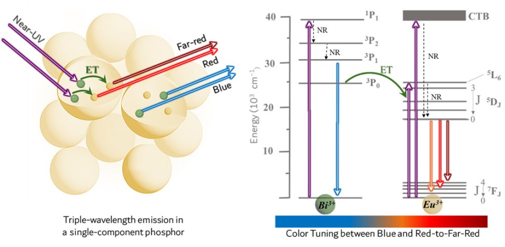Weak near-UV and blue spectral range absorptions (f-f electron transitions) prevent the use of Eu3+-based phosphors in LED applications. Therefore, we will demonstrate a sensitization mechanism of inner-particle energy transfer between Bi3+ and Eu3+ activator ions to increase the effective excitation at a desired wavelength. Bi3+-based phosphors, which affect blue light-sensitive cryptochromes and phototropin plant photoreceptors are an excellent choice due to the broadband blue emission centered at around 453 nm corresponding to the 3P1→1S0 allowed transition. Due to the interaction of Bi3+ with the host matrices, the position of the excitation and emission bands is highly related to the crystal structure, crystal field environment, and nephelauxetic effect of host matrices. In addition, through an excitation-driven strategy, the emission peak position of Bi3+ may be shifted, therefore the luminescence of trivalent bismuth ions may be adjusted. The large distance between the sites occupied by Eu3+ and Bi3+ in fluoride matrices makes it possible to achieve high-concentration doping of phosphor, resulting in strong emission and QE over 90%.