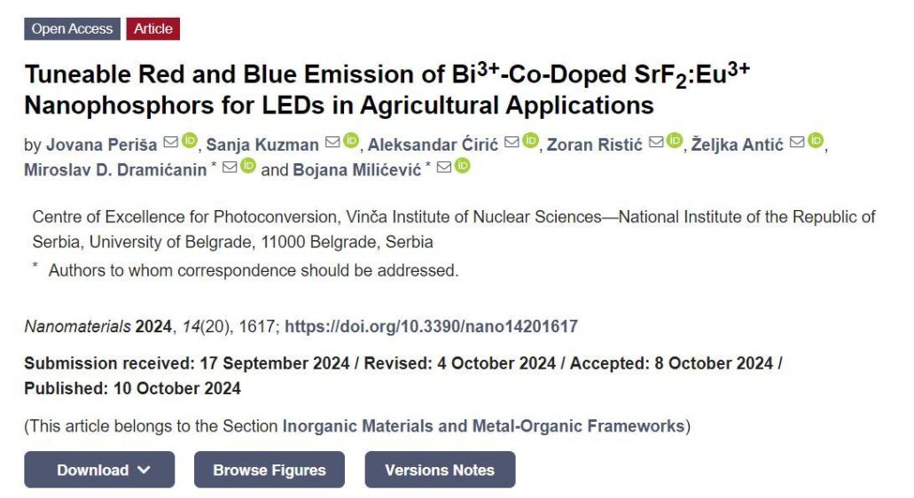 Истраживање спроведено уз подршку Фонда за науку Републике Србије, Број пројекта 10412, ЛЕД ТЕХНОЛОГИЈА ЗАСНОВАНА НА Еu3+ ЛУМИНЕСЦЕНЦИЈИ СЕНЗИТОВАНОЈ БИЗМУТОМ ЗА ИСПЛАТИВ РАСТ БИЉАКА У ЗАТВОРЕНОМ ПРОСТОРУ